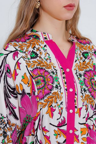 • Fuşya Krem Desenli Viskon Tesettür Elbise 2423