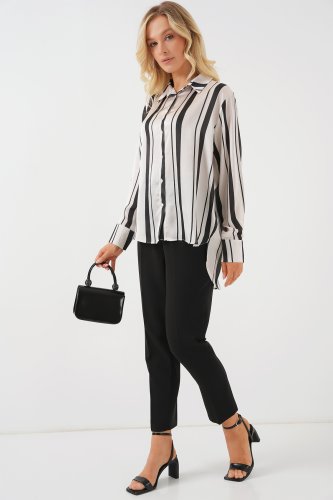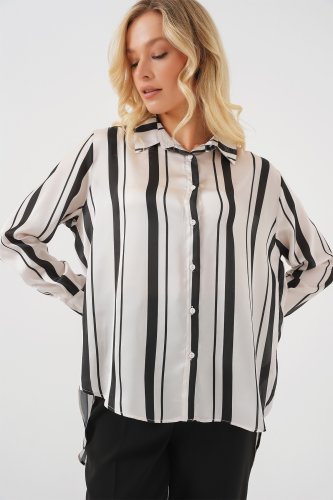 • Çizgili Uzun Saten Gömlek 20291 Siyah