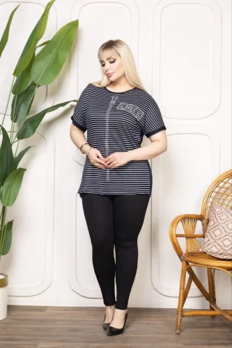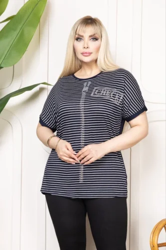Büyük Beden Çizgili Taş Detaylı Kısa Kollu Likralı Viskon Tişört Lacivert