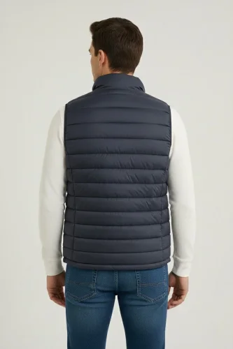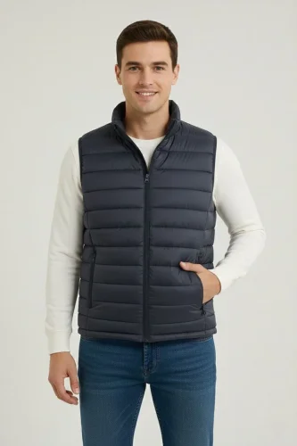 Erkek Şişme Fermuarlı Yelek Su itici Kapitone Astarlı Kumaş Cepli Hafif Kışlık Spor Rahat Kalıp Lacivert
