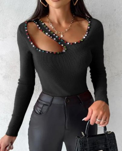 Kadın uzun kollu yaka taş ve dekolte detay kaşkorse bluz